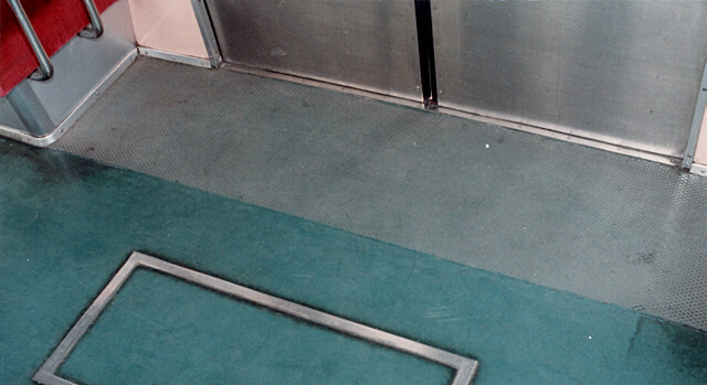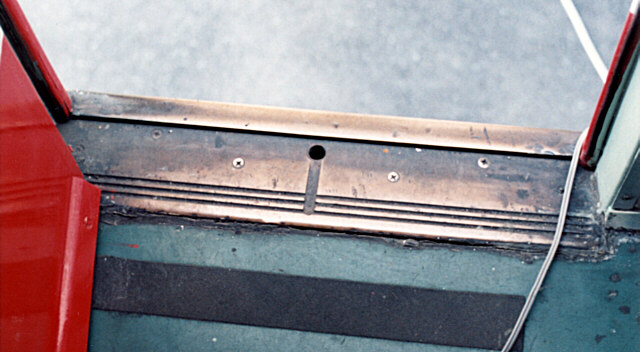 赤い電車の扉や貫通扉のステップは、当初は真鍮枠が取りつけられていた。しかし、真鍮のステップは雨水などで滑りやすいのか、後年真鍮枠は撤去、床板の段差だけが滑り防止の役目を果たすことになった。
