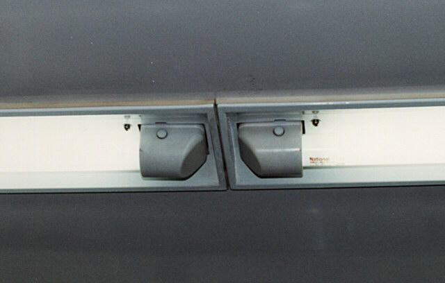 しかし、グローブは静電気により埃が付きやすい。それを防止するため表面に薬剤を塗布したが、年月が経過するにつれ、グローブそのものが黄ばんできて、照度が著しく落ちてきた。つまり、グローブそのものはない方がいいのではないか、と言うことで、500形(4)からはグローブなしの半埋め込み式で、反射板を使ったものとした。この際、扉付近の蛍光灯は省略された。900形や2000形も同様である(灯具の配置は詳細に調べていないので詳しいことは分からないのですが)。