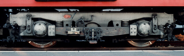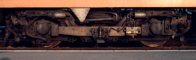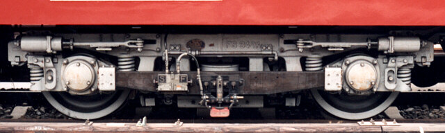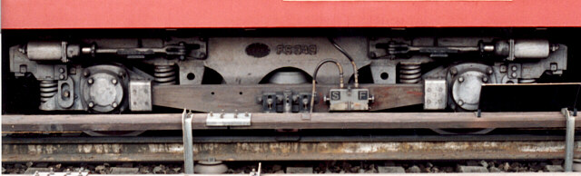 次へ→ 台車は車輪と電動機を収めるのはもちろん、丸ノ内線は第三軌条による集電なので、集電靴も付けられている。 台車は乗客にとっては実感しにくいが、乗り心地の良し悪しを決める重要な部分である。そのため、幾度かの改良、そして交換も行なわれている。 なお、車輪の間隔はいずれの台車も2300mmある。 300形を製作する際、台車枠は溶接にして軽量化を計ろうとしたが、強度に不安があったのでやめて、端梁のないH形の一体鋳綱式にした。これがFS301である。 軸箱方式は従来通りの軸箱守式であるが、摺動(しゅうどう)部分には耐耗レジンを使って保守を容易にした。車軸は12t軸で、主軸受けには複式複列球面コロ軸受けを用いた。 揺れ装置も従来通りの揺れ枕方式であるが、上下の揺れ枕は共に鋳綱で、枕バネの踏ん張りを出来る限り大きく、下の揺れ枕は分割して上の揺れ枕とピンで結んだ。 枕バネは二重コイルを3連としてオイルダンパを使用、軸バネはゲルリッツ式(コイルバネと板バネを直列にした)にした。それぞれのバネ定数は低くし、更にバネ座にはゴムを用いたので、上下振動に対して強く、結果乗り心地が良くなった。 軸箱の下側には自動列車停止弁がある。打子に当たると弁が開き、非常ブレーキがかかる。 このFS301台車は300形全車に取りつけられた。なお、“FS”は住友金属製を指す。