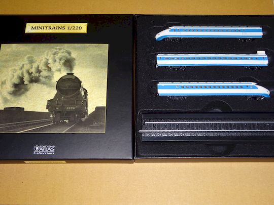 日車夢工房が作った「スーパーディスプレイモデル」第2弾のOゲージサイズ展示用精密鉄道模型。22-1の登場直後の姿がモデル。車外も車内も精密に作られており、前灯、室内灯も点灯、タイフォンも鳴るようになっている。制作はカツミ。 平成18年4月に今度は警笛のみならず車内アナウンスなどの音声が発するモデルが発売。1/30の0kmポストの模造品も付くが、車体自体の外観上の差異はない。価格は105,000円と高くなった。平成21年には126,000円で少数ながら、また平成26年には歴代車内チャイムが鳴るギミックが加わって150,000円(税抜き)で少数ながら再生産された。 日車夢工房のWeb http://www.n-sharyo.co.jp/yumekobo/index.html ●大人の超合金 新幹線0系 平成24年2月24日 バンダイ 1/45 78750円 ![]() バンダイが展開する「大人の超合金」第3弾。徹底的に実車調査を行った上、ご存命だった星晃氏が監修する程で、その出来はとにかく半端ではない。外観はもとより、車内まで徹底的に実車を再現。考証にはうるさい私でさえ全く隙がない。屋根が外せる、前頭のみならず天井の灯りが実車同様に灯る、椅子は全て転換式で転換可能等で、更に量販店では5万円程度で買える等、良い事だらけである。 更にプラットホームや開業式典再現パーツ、ワゴン販売や乗客、運転手の1/45人形も付いている。その凄さから「日本おもちゃ大賞2012ハイターゲットトイ部門優秀賞」を受賞した。 公式サイト(魂Web内) http://tamashii.jp/special/o_chogokin/spec/index04.php ●Zショーティー 1/220(全長除く) 0系新幹線こだま/ウエストひかり/フレッシュグリーン ロクハン 令和3年12月 ![]() Zゲージのショーティーモデル。3種類あり、いずれも3両編成で構成されている。パンタグラフはこの大きさの割に可動式となっている。さすがに価格を抑えるためか窓は埋められており、また積層痕があることから3Dプリンターで整形したと考えられる。 注意したいのは、これだけではZゲージ上の線路を電動走行させることは出来ず、別途動力セットを購入する必要がある。 なお線路、電源を含めたトータルセットも発売された。 ●Zゲージ 1/220 0系新幹線開業一番列車12両セット ロクハン 令和5年10月 Zゲージのフルスケールモデル。第1弾として開業一番列車のH2編成が選ばれた。光前頭が光るようになっており、機器搬入口(21形のみ)は印刷。ライトの大きさは先に出た「昭和にっぽん鉄道ジオラマ」よりも大きく、実車により似た。 気になる上屋根ルーバーは数が少ないものになっているが、1つ、奇数形式の東京寄り扉山側真上が本来縦縞なのに対し横縞と言う些細な間違いがある。本当に惜しいが、1/220と小さいため指摘しないと気付かないかも知れない。 ●Zゲージ 1/220 0系新幹線初期型「ひかり」基本4両/増結8両セット ●Zゲージ 1/220 0系新幹線「超特急ひかり2号」スターターセット 共にロクハン 令和6年10月 同じくZゲージのフルスケールモデルで、第2弾は初期型で先頭車の光前頭に手掛がついたFRP製の4両基本セットと8両増結セット、またスターターセットとして上り新大阪発開業一番列車「ひかり2号」のうち4両が入ったものが発売された。どちらもK6編成と言う設定。 後者は光前頭に手掛がないタイプだが、「ひかり1号」のように光るかどうかは不明。またフル編成化には増結8両セットを用いることで可能になっている。 ●Tゲージ 新幹線0系 令和2年10月中旬 1/450 ![]() ![]() チョコエッグ新幹線(上)との比較 Tゲージは軌間3mmでありながら自走する文字通りの世界最小の鉄道模型で、サイズは「チョコエッグ新幹線」や「Cゲージ」よりも小さい。新幹線0系は「Tゲージ悲願の製品」として令和元年にJAMコンベンションで発表された。構成は基本4両(21-26-35-22)と増結12両、また増結4両の存在も確認している(こちらの車種構成は不明)。基本4両の価格は18,000円。車体は3Dプリンターによる出力らしい。ただし現在は完全外国生産で、日本での入手は供給面等で大手メーカー程容易ではない。 当初は令和元年10月に発売予定だったが権利の関係で1年ずれこみ、更にコロナ禍等で延期を重ね、筆者は令和4年3月にようやく入手出来た。ただ日本の代理店はその後音信不通となり、現在は英国の販売サイトで入手出来る。 △週刊「世界の鉄道」 デル・プラド・ジャパン(現在は倒産) 平成15年8月 ●隔週刊「国産鉄道コレクション」 アシェット・コレクションズ・ジャパン 平成25年3月(テスト販売)、平成25年8月(静岡先行)、平成26年2月(全国) ![]() ![]() ![]() おなじみ分冊百科。前者の「世界の鉄道」は毎号1/160(日本型は1/150?)の模型が付いてくるもので、創刊号が当時最新鋭だった新幹線700系であった。世界各国の鉄道車両を模型化、日本型でも80系電車やD51等結構あったが、当初予定の60号から45号で打ち切りとなった。 因みに平成16年にはデル・プラド・ジャパンが「世界の航空機100年物語」を創刊したが、発刊半ばにして販路で提携していた扶桑社が契約違反を理由に契約解除、そのままデル・プラド・ジャパン