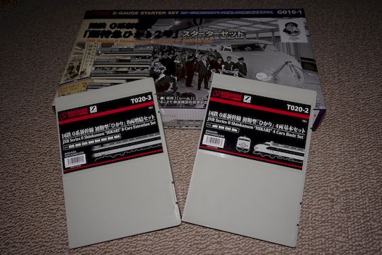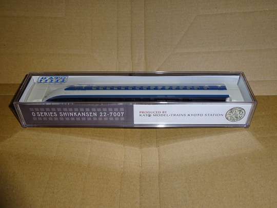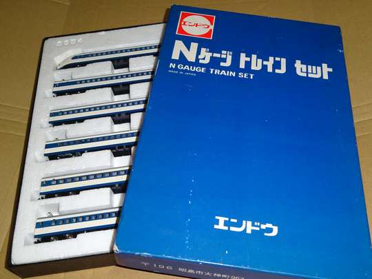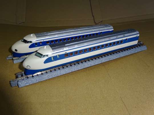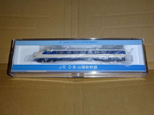 1/160 22-0,21-0(車体は22形),35-0,26-0,25-0を模型化 初のNゲージによる新幹線電車。古い製品のため、前灯は点灯せず(当時は室内灯ばかりか前照灯もないのが当たり前)、車体も流用が多い(21形が22形車体の流用)など今から見れば欠点が目立つが、当時は16両で走らせることを考えておらず、それで良かったのかも知れない。トリックス製モーターを採用し、パッケージにも大々的に書かれている。前灯は丸いくぼみで表現されているが、ちょっと小さ過ぎる欠点がある。 ●エンドウ Nゲージ鉄道模型 昭和53年 1/160 21-1000,26-1000,25-1000,36-1000,15-1000,22-1000を模型化 真鍮製の車体にプラスチック製のスカートを組み合わせたもの。モーター車は36形。値段は少々高く、走りは何となく重たい感じがする。初期製品では台車枠は省略されていたが、後期製品ではグレーの台車枠がある。26形は業務用室付きの1000番台。今のところ1000番台がメインのものとしては唯一である。前灯は穴が開いており、透明パーツがある。別売りのライトユニットを組み込めば前灯が前進では黄色、後進では赤く光るようになっているが、光前頭も半透明のパーツを使っているため、ライトユニットを組み込むと光前頭までもが光るようになっている。1000番台では実車はほとんど光らないのだが、何か理由があって敢えてそうしたのかも知れない。 ●KATO Nゲージ鉄道模型 昭和58年末 1/160 ![]() 21-2000,22-2000,25-2000,26-2200(公称26-2000),27-1000,36-1000,15-1000,16-2000,37-2500を模型化 前照灯が内蔵、室内灯がオプションで用意された画期的製品。前年末に発売された200系を追う形で製品化されたもので、電気部品などは200系のものを流用している。 取り敢えず全車種そろっているが、27・36形1000番台は実車は3両しかなく、実際は2000番台と組むことはなかった。また15・16・27・36形の屋根グリルが25・26形と同一となっているなど欠点も少なくないが、15・27形は1000番台の特徴である側非常口の彫り込みがちゃんとしてあり、全体としては完成度は極めて高い。屋根グリルに奥行感があることや、先頭車の前灯の反射板を車体と同一の成形にしたのはさすがKATOだな、と感じさせる。 ただ、現時点で「ウエストひかり」などのカラーバリエーションを全く出していないのが残念である。 ●KATO Nゲージ鉄道模型セット 平成14年 1/160 ![]() 既存の製品を一部リニューアル。パンタグラフのリニューアル(折り畳み式に変更)、車番の記入、グリーン車扉の金縁入れなど。8両基本と8両増結のセット販売で、16両揃えると全車小窓の「ひかり」編成になると言うもの。ただ、前灯周囲に銀色の縁取りを入れてしまったせいか、前灯がやたら大きく見えるようになった。連結面は従来製品のアーノルドカプラーのままで、外幌の表現がなく、現代のレベルからすると連結面が広過ぎるなどの欠点を持つが、半径280mmの急曲線を大規模な改良なくして通過させるためには仕方ないことなのだろう。中間車の屋根上は共通。でも、KATO製の0系の上屋根は別パーツになっているため、その気になれば15、16、27、36形の屋根パーツぐらいは作って別売りしても良いと思う。自作と言う手もあるが、グリルの奥行の表現が難しく、出来に段差があっては編成美としては面白くない。 マイクロエースが0系を出したことで対抗して出したとも言われている。特別企画品と言うことだが、基本セットは平成17年春になぜか再生産された。後に増結セットも再生産され、平成24年現在は定期的に再生産している模様。 ●KATO 東海道新幹線開業50周年記念 平成26年 1/160 一見初期車の模型化と思いきや、既存の2000番台を4両紙箱セットと4両増結、8両増結と出したもの。4両紙箱セットは「限定品」と銘打っているが、実際は車番が違うだけ。他社が0系を出すのを受けて慌てて実質的再生産に踏み切ったと考えられる。TOMIXに真っ向勝負しても良かったのに…… ●KATO Nゲージ鉄道模型セット 令和3年 1/160 令和3年には16両が組めるセットとして再生産。この際、前灯(ライト)の改良があり、1つの穴につき2灯(合計4灯)を表現出来るようにした。この4灯、既製品にも組み込めるように先頭車のスカート部のみの部品を別売した。KATOの0系は床板が外れにくいと言われていたが、部品の説明書には親切かつ丁寧な記述で簡単に取り外しが出来るとの評判だった。 そればかりではなく、サウンドボックスとして市場展開しているサウンドカードに0系を加えたが、その再現度は只者ではない。ジェイアール東海エージェンシーが監修したとのことだが、合成とは思えないリアル感が味わえると言うもの。試聴(KATOのサイト内) ●KATO京都駅店 0系新幹線22-7007 吹田市健都ライブラリー展示車両 大阪府吹田市に保存されている22-7007のタイプ品でKATO京都駅店の特製品。でも通販等で比較的遠方でも入手は難しくはなかった。パンタおおいがないためにタイプ品となっている。 ●KATO SHINKANSEN-0 ●KATO 旅するNゲージ「0系新幹線」 共に令和7年 1/160 後者は先頭者のみのディス