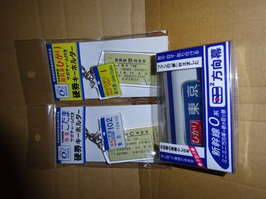 方向幕の1駒をブリキのプレートにしたもので、1セット6枚入り500円。新幹線2枚+在来線特急2枚+寝台特急2枚のセットになっている。全部で数パターンあるようだ。 ●方向幕キーチェーン第2弾 トミーテック 880円 平成23年3月 ミニチュア方向幕で、駒をつまみで変えることが、ボタンを押すことで発光させることが出来る。収録内容は7駒と少ないがまあ仕方ない。あるのは「ひかり」東京、新大阪、岡山、広島、博多、「こだま」静岡、名古屋(いずれも国鉄時代のもの、ただし「赤ひかり」はない) https://www.tomytec.co.jp/buhinmokei/lineup/mokei/khm02.html ●ミニミニ方向幕/サボチャーム付き硬券キーホルダー 令和6年 東海道新幹線60周年記念に出されたもの。 ●カード 昭和50年頃の鉄道カード
