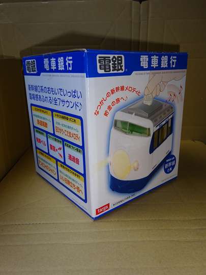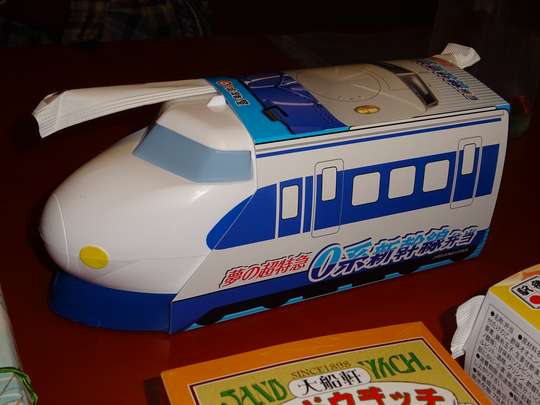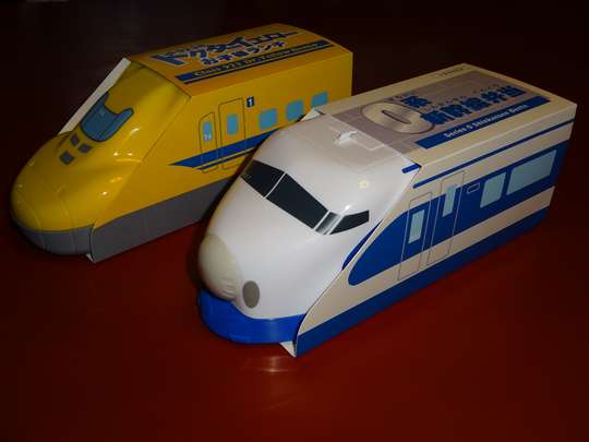 ●ポケデン タカラ 昭和59年![]() ![]() 0系では21-2000をモデル化。比較的近年の製品で、造形もしっかりとしている。Nゲージサイズながら価格も手頃、遊ぶのも手軽が売りであろう。チラシは写真を見るとキャラクターが「ゲームセンターあらし」の石野あらしにそっくりなので、すがやみつる氏(「あらし」の原作等)によるものであろう。 ●ダッシュ新幹線 文具か食玩らしく、鍵状の切符を差し込むとダッシュするもの。表記されている切符の区間によってダッシュする距離が変わると言うもの。21形(パンタなし)、22形(パンタあり)などがあり。 ●マシンロボ 12「新幹線」 ポピー(→バンダイ) 昭和57年頃 ![]() 0系バージョンと200系バージョンがあった ●トレインロボ 1「新幹線」タカラ 昭和58年頃 後にトランスフォーマーに統合 ●ヒカリアン JHR020 0系こだま「こだじい」 トミー平成10年頃 大窓車がモデル ●トランスフォーマートレインボット・ショウキ 令和4年6月 タカラトミー 約1/87、大窓初期車がモデル ![]() パッケージ全体 ![]() 内部 「鉄道模型金属車両コレクション」の0系(上)と比較 車両形態ではトミックスブランドを有するトミーテックの協力を得たと記述されている。確かにサボ等や埋込非常口等の表現はしており、一瞬車両単体でも見栄えする出来にはなっている。ただ、上屋根グリルは一部だけ少なくしており、なんとなく中途半端な感じは否めない。また完全に子供向けではなく(対象年齢15歳以上)、車両からロボットに変形させるだけでも70工程は必要である。1/87と大きく、値段も19,800円位する。 https://tf.takaratomy.co.jp/tf_mpg/mpg-01/ ●サンリオSHINKANSEN 平成10年頃 新幹線を擬人化したものであり、0系を模したものもある。各種グッズあり △新幹線文具セット 昭和63年頃 帝国ホテル列車食堂/バンダイ静岡工場 ![]() ![]() 100系の模型を巧みに「文具」としたもので、123形、168形、124形それぞれ何らかの役割が与えられている。帝国ホテル列車食堂の車内販売で発売されていた。 ●0系新幹線マグネット 製造・株式会社セイシン 発売・ジェイアール東海エージェンシー 平成20年頃 ![]() 4両編成のマグネットで、中間車1両が大窓になっているのが特徴。 ●「電車銀行」新幹線0系 タルガ 平成21年6月25日 大体6800円程度 貯金箱としての機能の他、お金を入れると前灯が点灯(黄色・赤色)、そしてチャイムや警笛などが鳴る仕組み。貯金箱は入れる硬貨にもよるが、10万円程度は貯められると言われている。 公式ページ http://www.targa-japan.com/dengin/dengintop.html ●0系新幹線夢の超特急弁当 淡路屋 平成20年 1050円 0系の完全引退に伴い、新神戸駅や西明石駅等に駅弁を展開する淡路屋が発売したもので、陶器製で0系を模した容器に食べ物が入っているもの。すし飯に穴子に蛸、ローストビーフが入っている。 0系引退後も長らく発売していたが、平成28年頃に陶器製からプラスチック製に改められて発売。その他、923形など他形式の駅弁も展開を始めた。ただしJR東海管内は笹八など、JR東日本ではJR東日本フーズや米沢駅・松川弁当店など、抗菌プラスチック容器自体はユニオン産業が製造しているらしい。これら弁当は東京駅改札内通路(JR東日本)の駅弁屋で購入出来るらしい。 プラスチック容器に変更後の容器 淡路屋 ●0系新幹線弁当 笹八 同じ笹八の「ドクターイエローお子様ランチ」と共に 0系人気は完全引退後も衰えることはなく、笹八からも独自の新幹線0系の弁当を出したようだ。こちらはJR東海の東海道新幹線駅構内などで買えるようだ。Webによる事前予約も、受け取り場所は限られるものの、リニア・鉄道館や大宮駅構内の販売所等がある。 笹八(手前)と淡路屋(奥)との比較 ●0系ロングバームクーヘン 二鶴堂 平成20年 0系完全引退に伴い博多の二鶴堂で製造販売した全長50cmの長いバームクーヘン。主にJR西日本の新幹線駅で売られていた。パッケージは0系の小窓車であった。 また平成22年頃には鉄道博物館でもパッケージが0系大窓車のバームクーヘンが売られたが、二鶴堂のものかどうかは不明。 尚、同様の商品でパッケージが他形式なのはタカチホと言う所で0系も入っているらしく、詳細不明。 ●0系新幹線パン フジ・キャラパンワールド 令和元年 1斤325円 デイジイで売られていたもの チョコクリームとカスタードの2種がある 中身もこのように成形されている 製品は真空パックされる 0系の形をしたパンで、首都圏の店舗で販売している。東京オリンピック開催を見込んで作られたもの。元々はフジ・キャラパンモールドとしてパンを象る金型の特許を取得、それをパン屋に頒布しているようだ。提供先は「デイジイ」や「石窯パン工房サフラン」などあり、取り扱い店舗は以下のサイトを参照。東京駅改札内のグランスタ東京のパン屋「デイジイ」でも売られている。 http://www.charapanworld.com/products/shinkansen_0kei.html ●ラップ JR東海ツアーズ 令和2年 非売品 JR東海ツアーズ開業30周年を記念して、支店店舗を利用した人に限定配