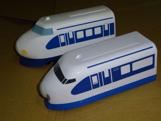 ●プラレール トミー(現:タカラトミー)![]() 手前は青白塗装初期、奥はライト点灯 よく見ると流線型の形状が違う おなじみプラレール。0系のロングセラー商品としては真っ先にこれを思い浮かべるが、実際は何度も改良・改修されている。当然ショーティー。3両編成で発売。 当初は白車体に赤スカートだった。最初期のものは電動式の他、手で転がして遊ぶものもあり(4両編成)、そちらは車体が幾分短かった。やがて青の正規塗装になり、後年は金型を変更した上で前灯、光前頭が光るようになった。前灯形状は砲弾状。平成8年に0系自体は生産中止したかと思いきや、直後に黄色に塗り替えただけの「ドクターイエロー」が、また窓下1本青帯を追加した「ウエストひかり」が発売となった。 平成12年頃には「ドクターイエロー」の新種が登場。テレビカメラ付きで、新規金型により海側・山側のグリルがちゃんと分けられている。 平成14年頃には通常製品の「ドクターイエロー」が新規金型によりリニューアルしたが、前灯は丸い窪みになった代わりに点灯機能はなくなった。依然として大窓車ベース。平成14年末頃には「フレッシュグリーン」が線路等と組み合わせたセット販売を行い、平成15年10月の「鉄道フェスティバル」では0系従来塗装が発売、一時期量販店でも見かけた。ただリニューアルしてもスカート部のディテールが甘い。更に平成16年夏にはJRロゴ入りの従来塗装が発売されたが、どうもリニューアル品とも形状が異なっているらしく(要調査)、一般流通しているかどうかは不明。平成16年10月には「東海道新幹線開業40周年記念セット」が4725円で発売、100系と700系と合わせた3両ずつ一度に入れたものとなった。0系は光前頭が東海道引退時の表記に、100系は流線型に東海道引退マークが、700系は「AMBITIOUS JAPAN」が入れられている(現在入手困難)。 平成20年10月には「ありがとう夢の超特急新幹線ひかり号セット」が発売予定。プラレールとしては異例の長編成である5両+高架線の円周線路+橋脚+架線柱のセットで5000円。 プラレールWeb http://www.takaratomy.co.jp/products/plarail/ ●プラレールアドバンス タカラトミー 平成23年10月14日 プラレールの線路の両端の溝を文字通り「レール」として利用する、プラレールよりも一段リアルにした製品。両端の溝を使うため、1本のレールで複線に出来る。そのため通常のプラレール車両よりもかなり小さい。 0系は第1弾の一つとして発売。4両編成で幾分短く出来ている。 その小ささ故、鉄道模型の情景製品をそのまま利用出来ると言った利点があった。 しかし子供が扱うと脱線が多発するなどプラレールに比べて安定性に欠け、定着することはなかった。グッドデザイン賞を受賞しており、筆者としても悪くはないと思っているのだが…… ●カプセルプラレール ユージン(現:タカラトミーアーツ) 平成12年4月 ![]() 写真は「ドクターイエロー編」 カプセル玩具。プラレールを一回り小さくしたもの。カプセル自販機(ベンダーマシン)で売られるのが基本。何が出るか分からないし、一度に出される種類が多いので、お好みの車種を正規で揃えるには相当の出資の覚悟が必要。なお一部ショップではセット売りしている所もある(本当は新品でセット売りをしてはいけない)。編成としてはゼンマイ巻き式動力の先頭車、車輪だけの中間車、同様に車輪だけの後尾車の3両で完結する。ゼンマイ式のものは0系大窓車を基本としているが、なぜか「ウエストひかり」と「ドクターイエロー」だけしかなく、「原色」のものは今なお発売されていなかった。後年、透明窓パーツを付けた新幹線の先頭車だけのシリーズで再販されたが、こちらも原色はなかった。 その後、動力を電池とモーターを用いた新シリーズが登場。金型そのものも新しく作り替えており、その際「原色」も登場した。こちらは本家プラレールの0系リニューアル版をそのままスケールダウンした形状になっている。 ユージンWeb http://yujin-net.com/ ●サークルKサンクス限定・新幹線カプセルプラレール10周年記念キャンペーン 平成20年12月2日 ![]() コンビニエンスストアーチェーン「サークルKサンクス」において、缶飲料のおまけとしてカプセルプラレールを付けることは前から行っていたが、今回は「新幹線カププラ10周年」として12形態の新幹線24種(前部車+後部車)を付けることとなった。特筆すべきは0系は旧金型(ゼンマイ車)で始めて「原色」が登場したこと。種別選択可であり、またキャンペーン開始時は0系が営業運転から退いた直後だったため、0系が特段と注目されたことであろう。0系金型は他にもフレッシュグリーンとドクターイエローが出ている。いずれも車体は全体が塗装されており(平成12年のシリーズは一部印刷のみ)、また透明な窓パーツも付けられている(平成12年のシリーズでは窓パーツはなかった)。 ●ミニモータートレイン エポック社 平成14年〜 ![]() 写真は「さよなら0系新幹線スペシャル」 カプセル玩具で、